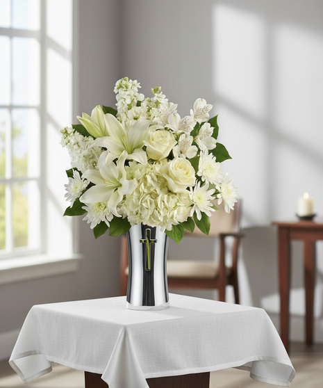 Show your sympathy with style and grace. A shining silver finish and reverent cross cut-out makes this stunning ceramic vase the perfect accompaniment for a lush bouquet of pure white hydrangea, lilies, alstroemeria and stock. White hydrangea, white Asiatic lilies, white alstroemeria, white stock, and white cushion spray chrysanthemums are accented with lemon leaf.