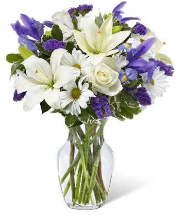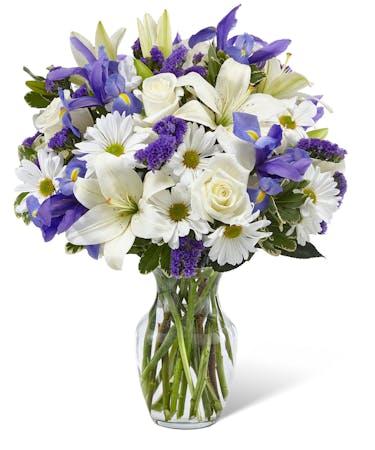 Our Sincere Respect Bouquet is a soft and lovely way to express your condolences for your special recipient's loss. This bouquet features a wonderful blending of white roses, white traditional daisies, and white Asiatic Lilies with colourful blue iris and purple statice. Flowers are expertly presented in a classic clear glass vase. This fresh flower arrangement is a wonderful way to commemorate a life well lived.