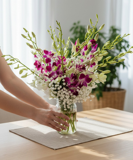 Ten stems of miniature orchids are hand arranged in a glass vase with added baby's breath. What a splendid combination that's sure to make the right impression.