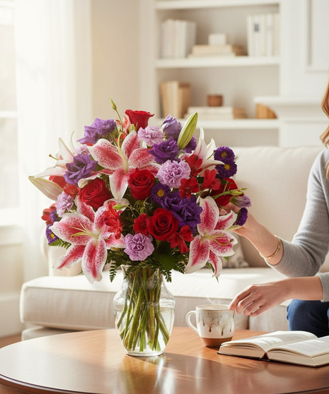 Our Stunning Beauty Bouquet is an annual top seller and customer favourite. Featuring a beautiful combination of flowers expertly hand arranged in a clear glass gathering vase. Flowers include red roses, Stargazer lilies, lavender carnations, purple Matsumoto asters, purple double lisianthus and red alstroemeria along with lush greenery. This elegant floral design is a wonderful way to express your love, friendship and best birthday wishes.