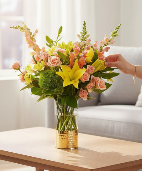 The Sunbeam bouquet is the perfect gift to send a dose of heartfelt positivity their way. Sunny yellow lilies and charming peach roses combine with snapdragons and green trick dianthus to deliver your best wishes. This arrangement looks even more stunning in our keepsake tall glass, gold-dipped vase.
