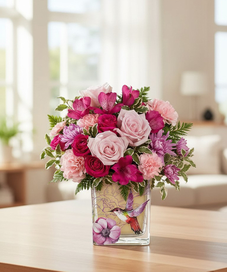 Like a hummingbird flitting around a secret garden, this delightful bouquet of pink roses in a vintage-inspired glass cube is a magical gift on Mother's Day or any special occasion. This beautiful bouquet includes hot pink spray roses, dark pink alstroemeria, lavender cushion spray chrysanthemums, pink carnations, miniature pink carnations, leatherleaf fern and pitta negra. Hand delivered in a Sweet Hummingbird cube.
