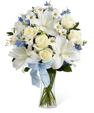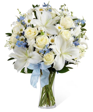 Our Sweet Peace Bouquet is an elegant way to convey your sympathies for the loss of their child. White roses, daisies, and lilies are sweetly accented with light blue delphinium, lush greens and a light blue organza ribbon, arranged to perfection in a clear glass vase. This is an exquisite way to offer comfort during this time of grief and sadness.