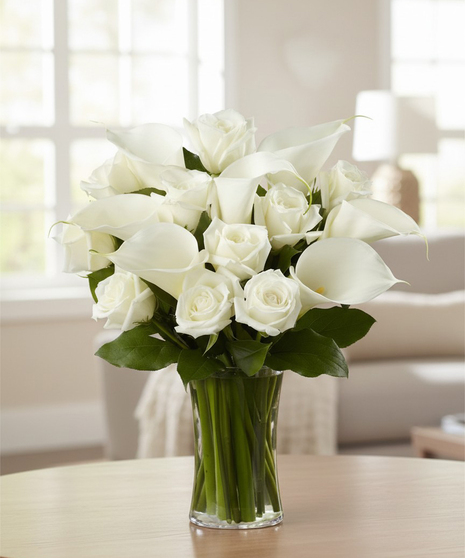 Our Sweet Solace Bouquet is an elegant floral arrangement that encourages peace and offers sympathy. Pure white roses and calla lilies are simply set amongst verdant greens in a clear glass gathering vase. Surely this is a meaningful gift that will help your special recipient through this trying time of grief and loss.