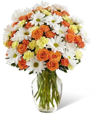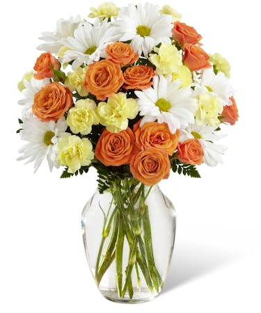 It's so easy to send some smiles to a friend, colleague or loved on today. This affordable bouquet features a sweet combination of orange spray roses, yellow mini carnations and white daisies. Flowers are arranged in a clear glass vase with some added greenery for a perfect light and delightful touch.