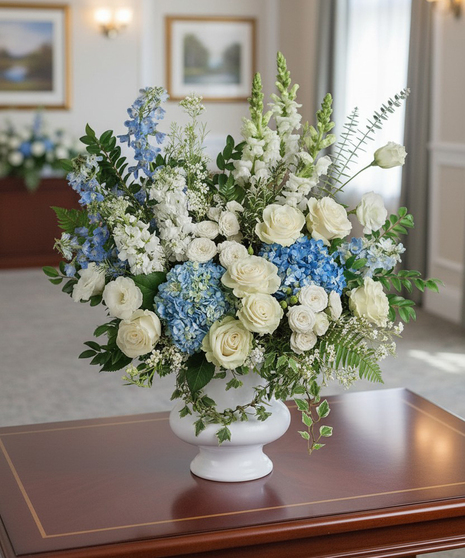 A treasured tribute to your beloved, this gorgeously grand bouquet of soft blue hydrangea and pure white roses is reminiscent of a clear sky, a hopeful reminder of life and love. This beautiful bouquet of light blue hydrangea, white roses, white spray roses, white lisianthus, light blue delphinium, white snapdragons, white stock, and white waxflower is accented with huckleberry, variegated ivy, spiral eucalyptus, dagger fern, and lemon leaf. It is delivered by Ital Florist in Toronto and across the GTA in a white urn.