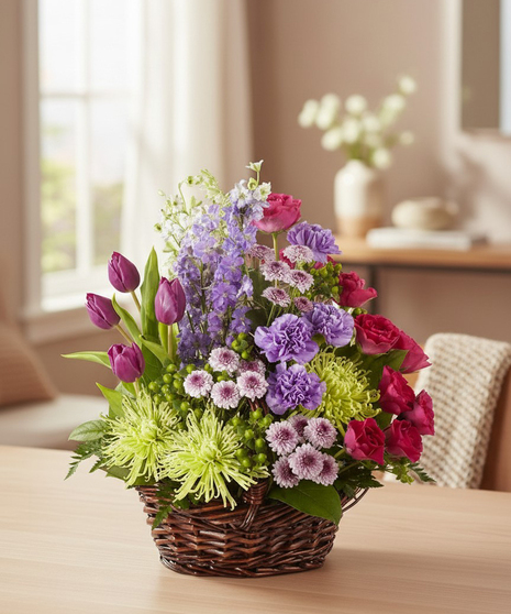 Ital Florist's Truly Loved Flower Basket exudes fantastic colour, warmth and cheer to convey your most heartfelt sympathies. Purple tulips, fuchsia spray roses, lavender carnations, lavender larkspur, lavender button poms, jade spider mums, green hypericum berries and lush greens are beautifully arranged in a brown willow basket. This basket is a wonderful way to show how much you care.