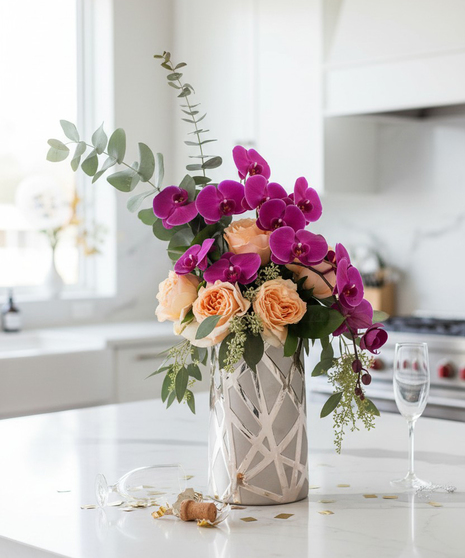 The Velvet Orchid Bouquet is a striking fusion of elegance and modern style. Bold purple orchids pair beautifully with peach roses, accented by spiral eucalyptus, seeded eucalyptus, and Israeli ruscus. Designed in a tall contemporary vase, this arrangement makes a sophisticated statement for anniversaries, celebrations, or as a luxurious gift.