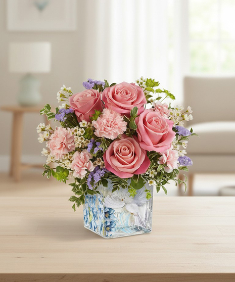 Soft, elegant, and full of charm, the Whisper of Grace Bouquet features blush pink roses paired with delicate pastel blooms in a beautifully designed glass cube adorned with doves and floral artwork. This graceful arrangement captures a sense of calm and beauty, making it a lovely choice for any occasion. Designed with pink roses, miniature pink carnations, lavender sinuata statice, white waxflower, bupleurum, and oregonia, it brings timeless elegance to any space.