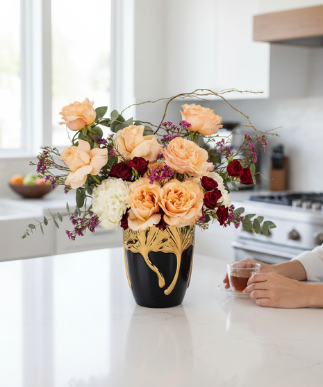 The Whisper of Willow Bouquet is an artful one-sided design that combines soft romance with rich texture. Featuring lush white hydrangea, warm peach roses, vibrant red spray roses, and delicate purple waxflower, it is accented with spiral eucalyptus and curly willow for height and movement. Elegant and unique, this bouquet makes a beautiful gift for any occasion.
