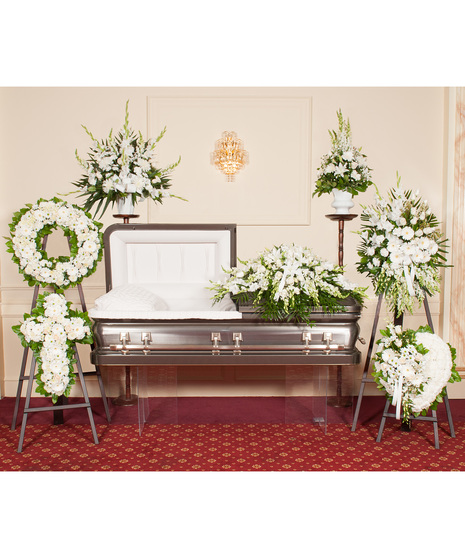 A traditional white cross of flowers including roses, chrysanthemums, gerbera and more for display during a visitation or funeral service.