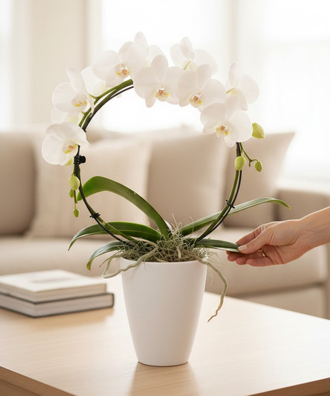 A white phalaenopsis orchid is hooped and seated in a white ceramic pot. This is a lovely, long lasting orchid plant. Suitable for many occasions, including as a sympathy gift sent to the family home.