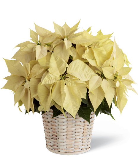 The elegant winter white poinsettia is a lovely variation to a classic holiday gift. This large poinsettia plant with its creamy white and contrasting dark green leaves arrives ready to enjoy in a white wicker basket.