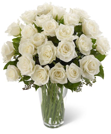 Our White Rose Sympathy Bouquet offers a gift of simple elegance to bring peace and comfort during a time of grief and loss. A beautiful bouquet of white roses arrives accented by lush greens expertly arranged in a clear glass vase. Giving an arrangement of white roses is a traditional gift to express sincere sympathy.