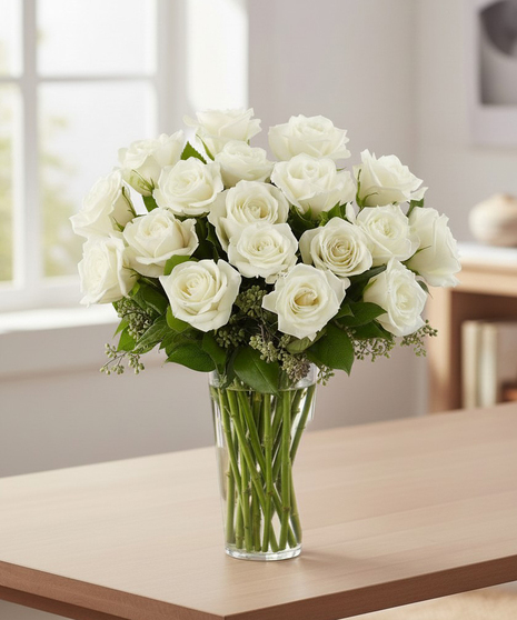 Our White Rose Sympathy Bouquet offers a gift of simple elegance to bring peace and comfort during a time of grief and loss. A beautiful bouquet of white roses arrives accented by lush greens expertly arranged in a clear glass vase. Giving an arrangement of white roses is a traditional gift to express sincere sympathy.