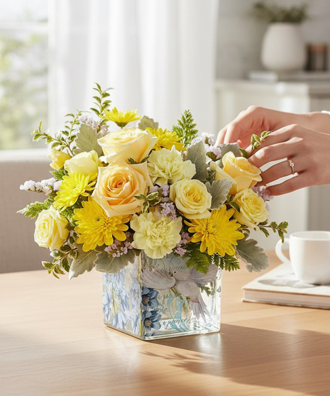 This bouquet features light yellow spray roses, light yellow carnations, yellow cushion spray chrysanthemums, and lavender sinuata statice, complemented by silvery dusty miller, leatherleaf fern, and oregonia for added texture and movement. Designed in a keepsake glass cube adorned with graceful dove and floral artwork, this arrangement offers a meaningful way to celebrate spring, share encouragement, or express thoughtful support.
