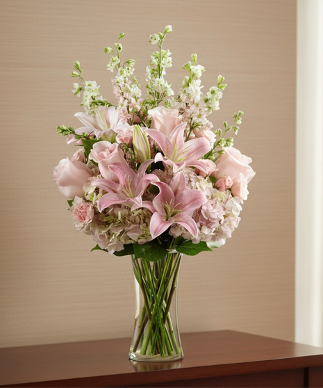 Our Wishes & Blessings Bouquet is a special way to offer your condolences for their loss and commemorate the life of the deceased. Soft pink roses, spray roses, lilies, hydrangea and larkspur are brought together in a clear glass vase to create an wonderful display of soft serenity.
