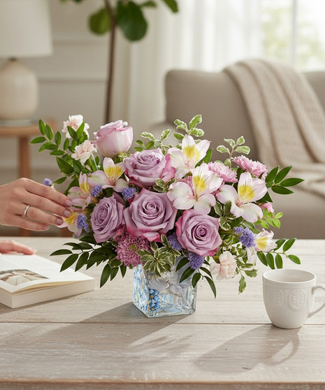 Peaceful and poetic, the Written in the Sky Bouquet is a graceful expression of calm and beauty. Lavender roses and soft pastel blooms come together in a soothing palette that feels light, airy, and perfectly suited for spring.