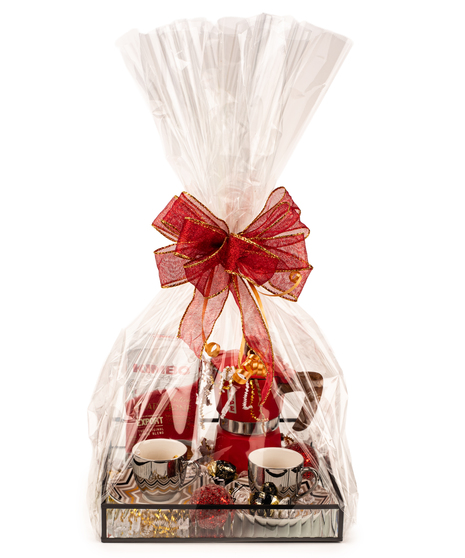 Celebrate the joy of the season with of Caffé Natale Gift Set - a luxurious and modern coffee experience beautifully arranged on a stunning glass tray. This set includes an authentic Kimbo Italian coffee, a stylish red Pepe stovetop espresso maker, and a pair of elegant silver espresso cups with matching saucers, making it the perfect gift for any coffee lover.