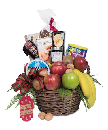 This mouth watering basket is abundant enough for an office or group to enjoy, and also perfectly suitable for a single, couple or family. To start, a large natural wicker basket is filled to overflowing with a popular variety of fresh fruit like apples, oranges and bananas. Then, a variety of wonderful gourmet treats are added - such as chocolates, cheese, crackers, compote, cookies, assorted nuts and much more. Seasonal trim includes cedar greens, a festive plaid bow and happy holidays tag. Our Better and Best versions have even more delicious items!