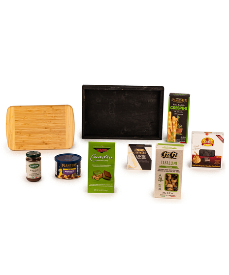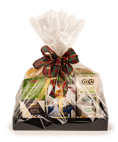 The Gourmet Host's Holiday Tray is an impressive collection of savoury bites, sweet indulgences, and entertaining essentials - beautifully presented on a sleek black tray and wrapped in festive cello with a luxurious plaid bow.