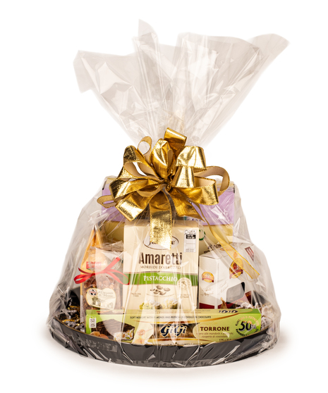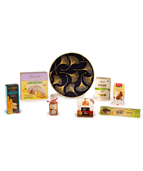 Celebrate the season with pure elegance. Our Holiday Gold Luxe Basket is beautifully arranged inside a stunning black round tray with a gold-art detail, filled with eight premium Italian holiday favourites.