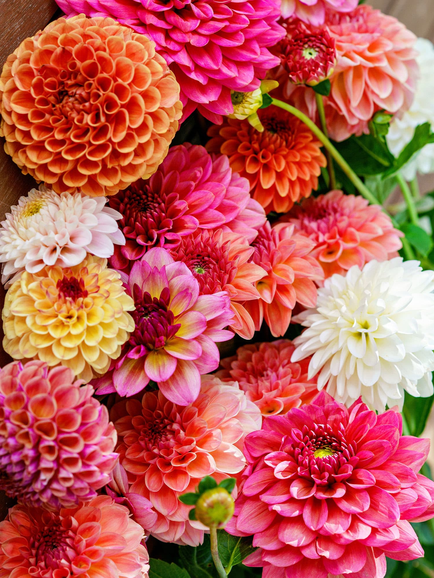 - Dahlias — With layered petals that look perfectly sculpted, dahlias bring a full, lush texture that mirrors summer gardens at their peak. They are abundant, with intricate textures that give arrangements a bold, artistic look grounded in the season. Available in vibrant pinks, corals, oranges, whites, and deep reds, dahlias reflect the vibrant colour story of summer while adding depth and drama to bouquets and centrepieces.