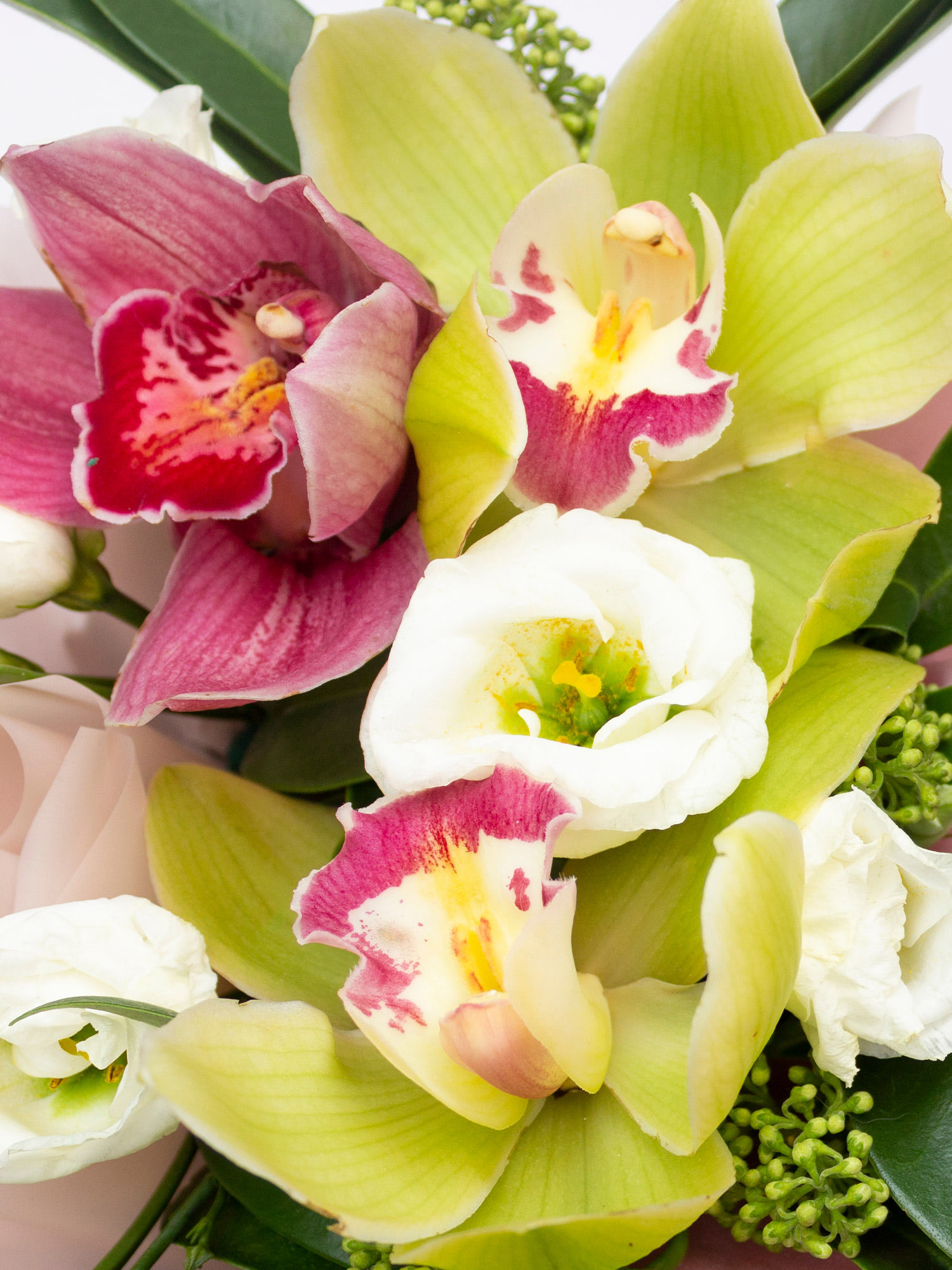 - Orchids — Smooth and velvety with gently curved petals, orchids are beloved, refined, and luxe. They offer soft dimension yet new vibrancy and symbolism through multicoloured petal tones. Their graceful symmetry and elevated form bring rich tropical beauty to the season, pairing beautifully with glossy greens, sculptural stems, and brighter summer florals. In shades of pink, white, purple, orange, yellow, and green, orchids add a luminous layer of colour that’s expressive and flawlessly suited to summer hosting.
