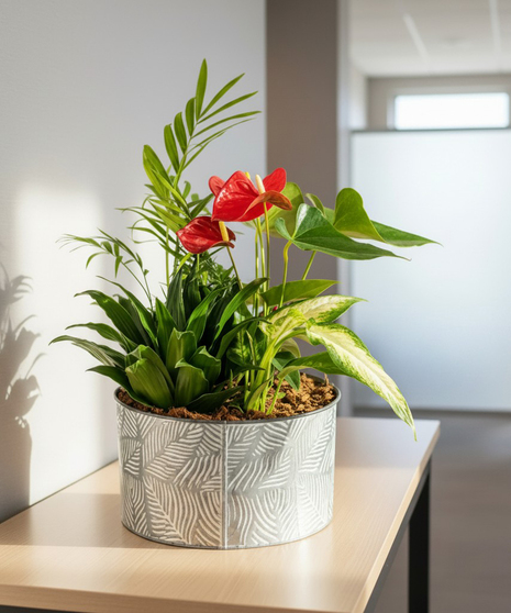 This beautiful anthurium garden planter features vibrant red anthurium blooms surrounded by lush tropical foliage arranged in a stylish ceramic container. The glossy red flowers stand out against the rich greenery, creating a striking yet natural display of texture and colour.